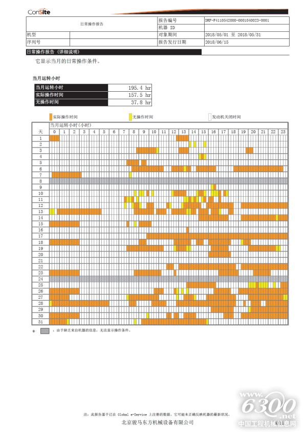 另一方面,ConSite还会为客户发送月度报告,让机主更好地掌控机器的运行情况。在ConSite为鲁忠孝提供的一份10页之多的月度机器操作信息报告中,详细地列出了机器状态、日常操作等信息,这其中包括但不限于:1、机器月度总油耗、每小时油耗等,及其与上月相比的差异;2、机器每天运转时间和油耗;机器每天的实际操作时间、无操作时间以及发动机关闭时间;3、机器的动力系统、液压系统各关键部件、关键指标的详细报告。与此同时,在报告中,ConSite还会为客户提出有针对性的改进建议。