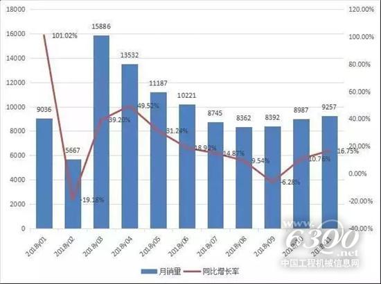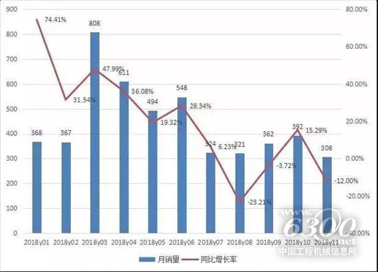 2018年11月,纳入统计的国内主要平地机生产企业合计销售平地机308台,同比下滑12%;1-11月,平地机累计销售4900余台,同比增长19.1%。虽然增速明显放缓,但其销量处在历史同期最高值。