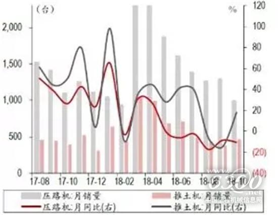 10月份压路机销量984台,同比下降10%,1-10月压路机累计销售16106台,累计同比增长9%。其中,出口销量294台,同比增长46%,占比27%,持续小幅提升。