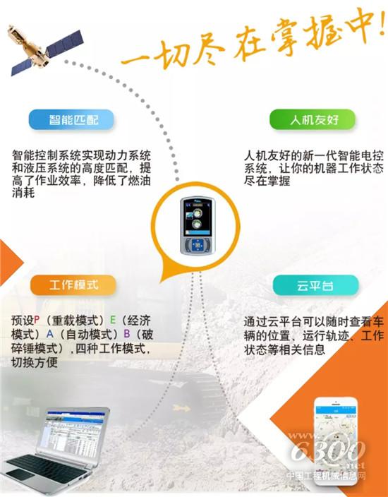 智能控制系统实现动力系统和液压系统的高度匹配,提高了作业效率,降低了燃油消耗。人机友好的新一代智能电控系统,让你的机器工作状态尽在掌握。预设P(重载模式)、E(经济模式)、A(自动模式)、B(破碎锤模式)四种工作模式,切换方便。通过云平台可以随时查看车辆的位置、运行轨迹、工作状态等相关信息。