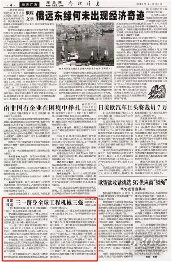 11月24日《参考消息》摘编了《日本经济新闻》报道:《中国三一重工跻身全球工程机械三强》,以下为主要内容: