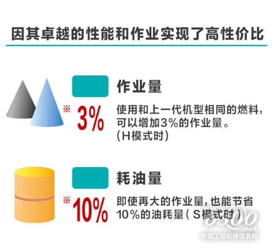 ●借助新液压系统、ITCS系统、共轨式电子控制发动机三大技术,减少不必要的燃料及功率损耗,实现更低油耗。两种作业模式轻松切换。选择S档模式优先低油耗,适用一般作业,重视省油的模式,相同作业时间内油耗可降低10%。H档模式,适用于追求速度的作业。