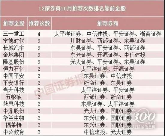 近日,据《中国证券报》统计,12家券商披露10月月度投资组合,三一重工成为券商最看好的“金股”,被推荐次数最多,获得了太平洋证券、中信建投、平安证券、浙商证券4家券商的联合推荐。