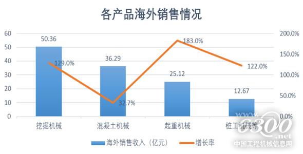 分产品看,公司主要产品海外销售均实现高速增长,挖掘机销售50.36亿元,同比增长129.04%,混凝土机械销售36.29亿元,同比增长32.71%,起重机械销售25.12亿元,同比增长182.97%,江南登录网址app下载 等其他产品销售12.67亿元,同比增长121.98%。