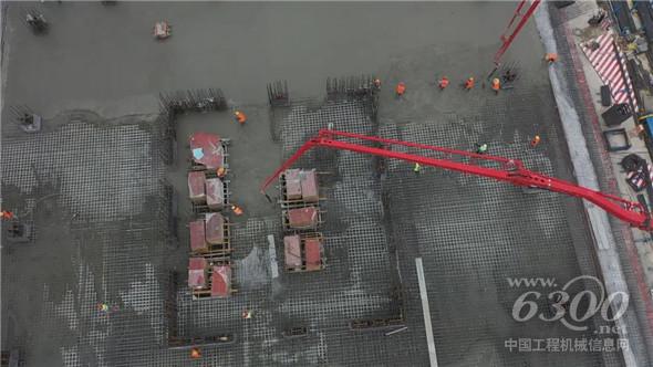 据悉,本次混凝土底板最深处厚度达6米,强度等级C40P8,属于高强度大体积混凝土底板浇筑。共有三一重工混凝土设备:6台泵车、52台搅拌车、 3台装载机 、2条180系列生产线、1条300系列生产线参与施工。