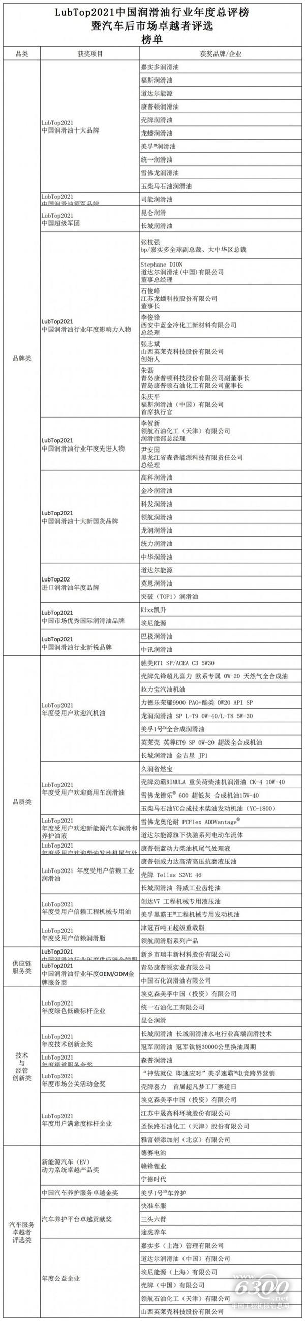 3月28日,万众瞩目的“LubTop2021中国润滑油行业年度总评榜暨汽车后市场卓越者评选”颁奖盛典云端全球发布。以“破维,拓新局”为主题的“LubTop2021总评榜”由中国润滑油信息网 (www.sinolub.com)、《润滑油市场》杂志发起主办,法兰通联展览(北京)有限公司(AMR中国国际汽保汽配展主办方)联合主办,业内权威机构和众多主流媒体支持协办,对包括在设备润滑和汽车服务市场表现优秀卓越的润滑油产业链相关产品和服务进行荣誉认证。据组委会介绍,评选活动以技术创新、市场表现、用户满意度、行业影响力等四大维度为品牌核心评价体系。在企业申报资格海选,第三方权威机构质量检测结果(一票否决权)基础上,通过线上用户投票、专业市场调研、专家导师团评审、媒体观察评议流程,以线上线下大数据+智能算法产生LubTop品牌荣誉指数,确定LubTop2021总评榜暨汽车服务卓越者榜单。全球一线润滑油品牌嘉实多、美孚、壳牌,中国超级军团长城润滑油、昆仑润滑等世界五百强企业品牌获得“LubTop总评榜”行业大奖。