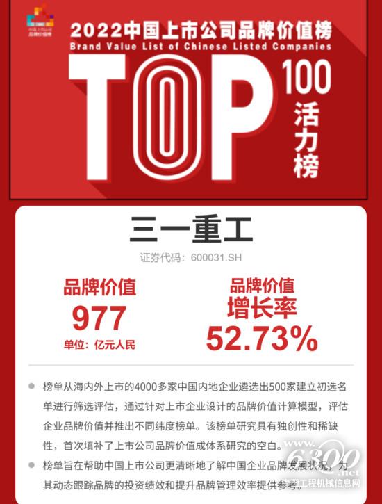 5月10日,每经品牌100(指数)上线仪式暨2022中国上市公司品牌价值榜发布会举行。会上,三一重工以977.49亿元的品牌价值,位列“2022中国上市公司品牌价值榜”总榜第40名,第4次入围中国品牌价值榜,较上年跃升19个名次,稳居工程机械行业第一。