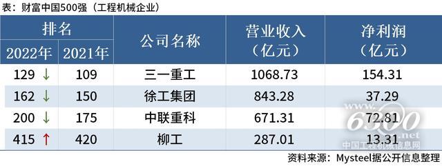 1. 三一重工、徐工集团、中联重科、柳工上榜财富中国500强,净利下滑10%;