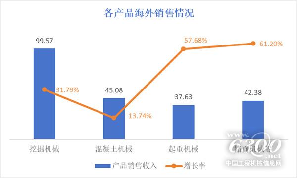 分产品看,公司主要产品海外销售均实现快速增长,挖掘机械99.57亿元,同比增长31.79%;混凝土机械45.08亿元,同比增长13.74%;起重机械37.63亿元,同比增长57.68%;路面机械等其他产品42.38亿元,同比增长61.2%。