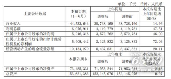 三一重工披露半年报显示,公司实现营收445.34亿元,同比上升14.96%;归母净利润52.16亿元,同比增长46%。其中,二季度营业收入 234.85 亿元,同比上升 11.43%;归属于上市公司股东的净利润27.45 亿元,同比增长 37.76%。