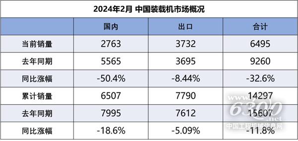 2024年2月销售各类装载机6495台,同比下降32.6%。其中国内市场销量2763台,同比下降50.4%;出口销量3732台,同比下降8.44%。2024年1-2月,共销售各类装载机14297台,同比下降11.8%。其中国内市场销量6507台,同比下降18.6%;出口销量7790台,同比下降5.09%。