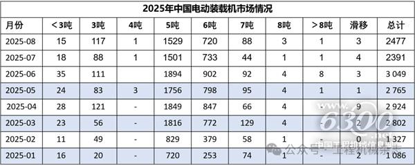 2025年8月销售电动装载机2477台( 3吨以下15台,3吨117台,4吨1台,5吨1529台,6吨720台,7吨88台,8吨3台,8吨以上1台,滑移装载机3台)。